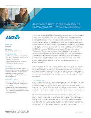 ANZ Bank chose VMware AirWatch® to securely manage the bank’s fleet of more than 18,000 mobile devices that are used in 34 countries. ANZ Bank uses AirWatch to manage bankers’ company-issued mobile devices, and to manage digital tools such as Apple® iPad® kiosks in bank branches. Learn more about VMware AirWatch solutions built specifically for the finance industry.
